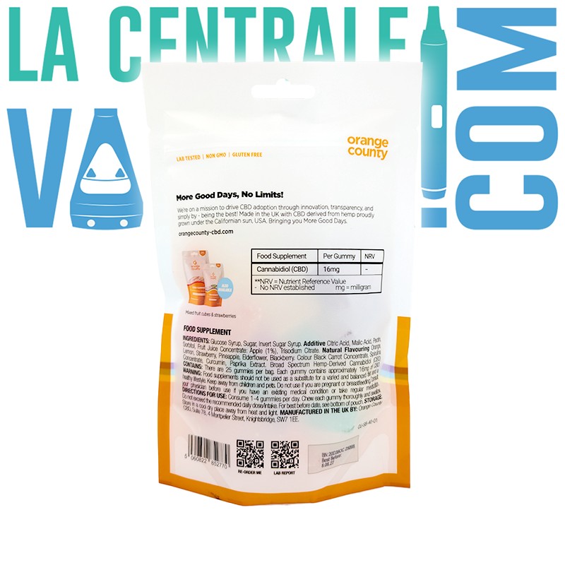 Bredspektrum Cannabidiol (CBD) härrörande från hampa, Glukossirap, Socker, Invertsocker, Syrabildare : Citronsyra, Äppelsyra; Geleringsmedel: Pektin; Fuktighetsbevarande medel : Sorbitol; Fruktjuicekoncentrat; Äpple (1%); Surhetsreglerande medel: Trinatriumcitrat, Naturliga aromer: Äpple, Citron, Apelsin, Hallon, Surkörsbär; Färgämnen: Koncentrat av svart morot, koncentrat av spirulina och gurkmeja.